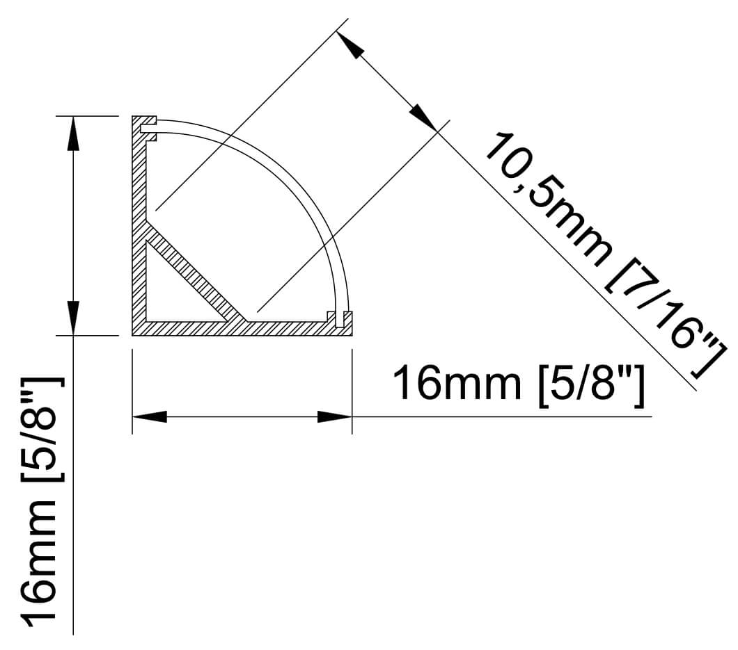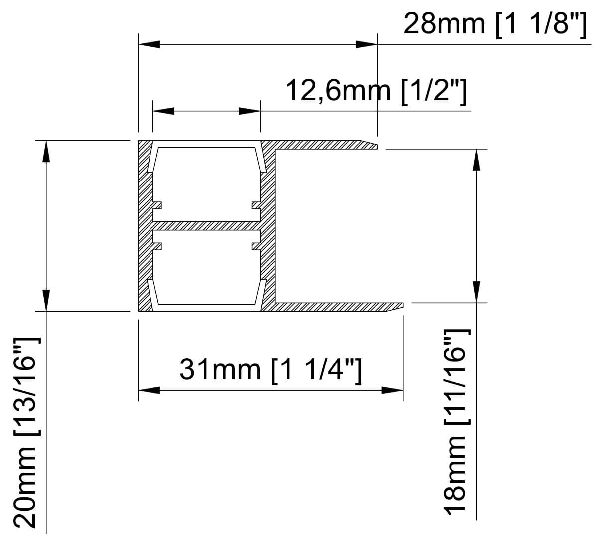 For installation with 8 mm glass. The #64 profile comes with a diffused PC cover. Length: 3000mm, 118 1/8". Height: 20.5mm, 13/16". Exterior Width: 13mm, 1/2". Inside Width: 11mm, 7/16" Finish grey or Black. Protects the LED tape and diffuses the heat of the LED tape for a longer life. Glass not included. Sold per meter.